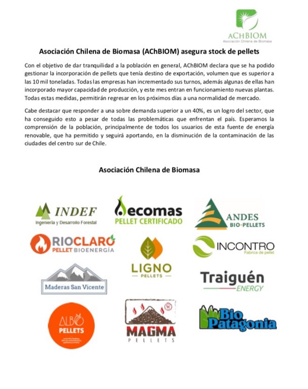 A través de un comunicado oficial, la Asociación Chilena de Biomasa indicó que todas las plantas asociadas a AChBIOM están trabajando a doble turno para superar la escasez de este combustible y además se ha gestionado incorporación de pellets destinado a exportación. “Esperamos pronto salir de la situación causada dada la alta demanda en situación de pandemia”, indicaron a través de su Twitter.