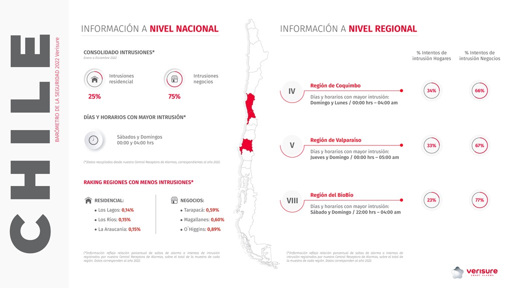 ÍNDICES EN LAS CIUDADES MÁS VISITADAS EN VERANO El análisis de Verisure realizado en base a información recopilada por su Central Receptora de Alarmas (CRA) también abordó los indicadores de las regiones del país que probablemente registren una mayor presencia de turistas. De esta forma, el estudio reveló tendencias respecto a los intentos de intrusión de las siguientes zonas: Durante 2022 en la región de Valparaíso un 33% de intentos de intrusión se produjo en hogares y un 67% en negocios; en tanto, en Coquimbo, un 34% y 66% respectivamente, mientras que la Región del Biobío registró que el 23% de los intentos de intrusión se reportó en hogares y 77% en negocios. |
